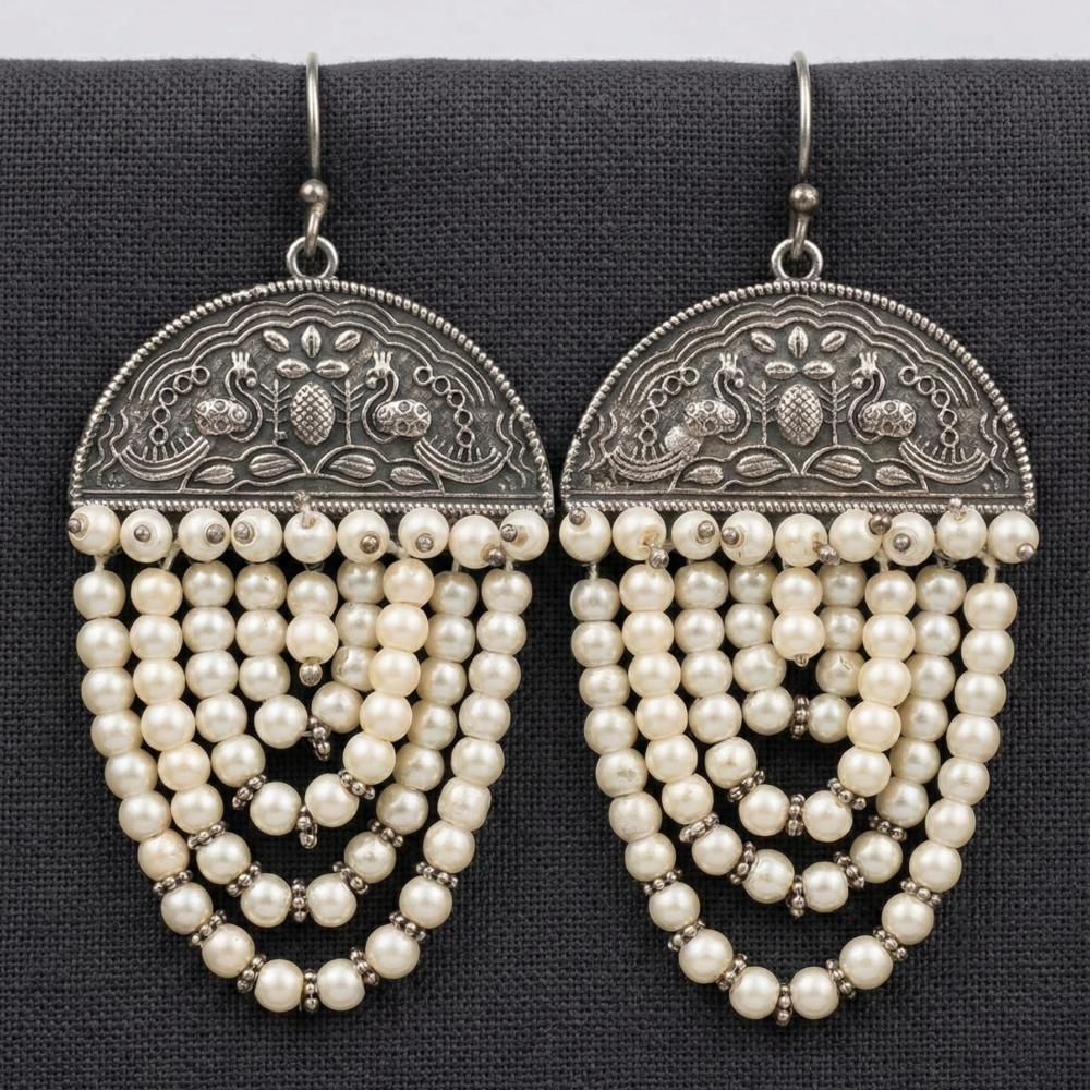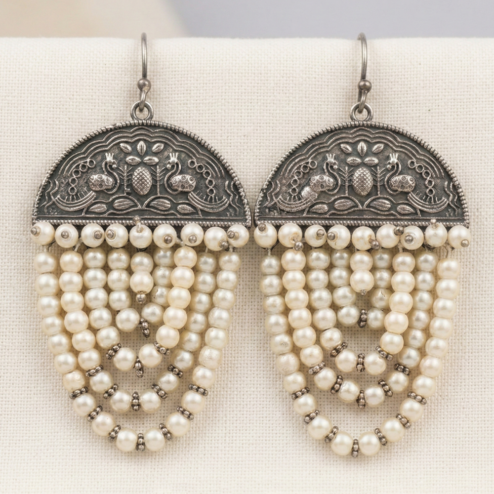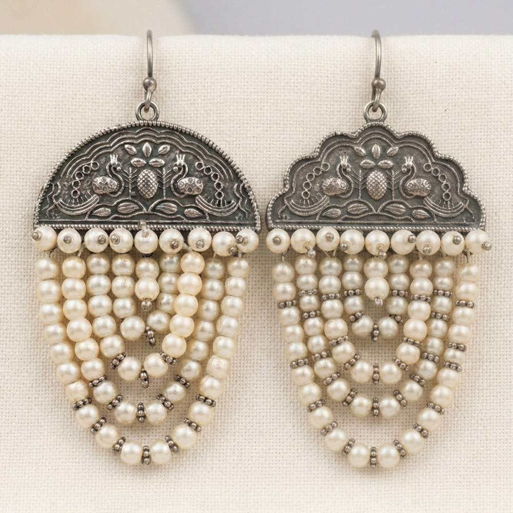 Celebrate the timeless beauty of Indian heritage with our Mayura Pearl Cascade Earrings. These stunning pieces are crafted from high-quality alloy with a premium oxidized silver finish, giving them that coveted vintage, “antique” look.