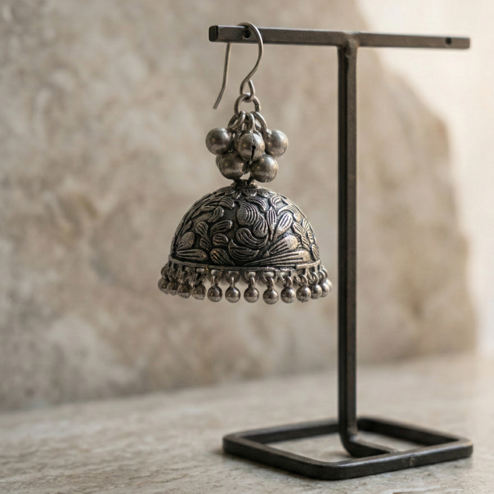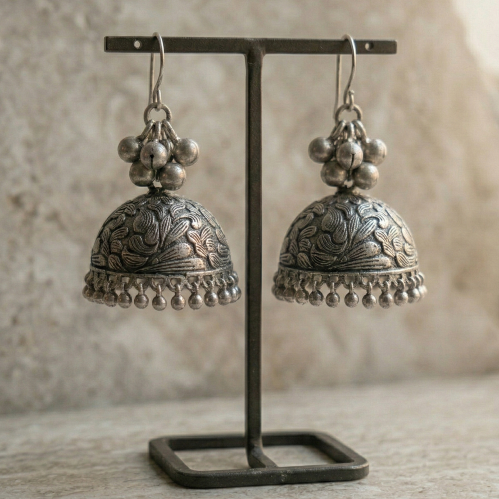 The dome (Jhumka) is adorned with detailed embossed floral patterns, topped with a cluster of silver beads for a layered, voluminous look. Finished with delicate hanging ghungroos at the base, they offer a subtle, rhythmic chime with every movement. Lightweight enough for all-day wear yet bold enough to make a statement, these are a must-have for every ethnic jewelry collection.