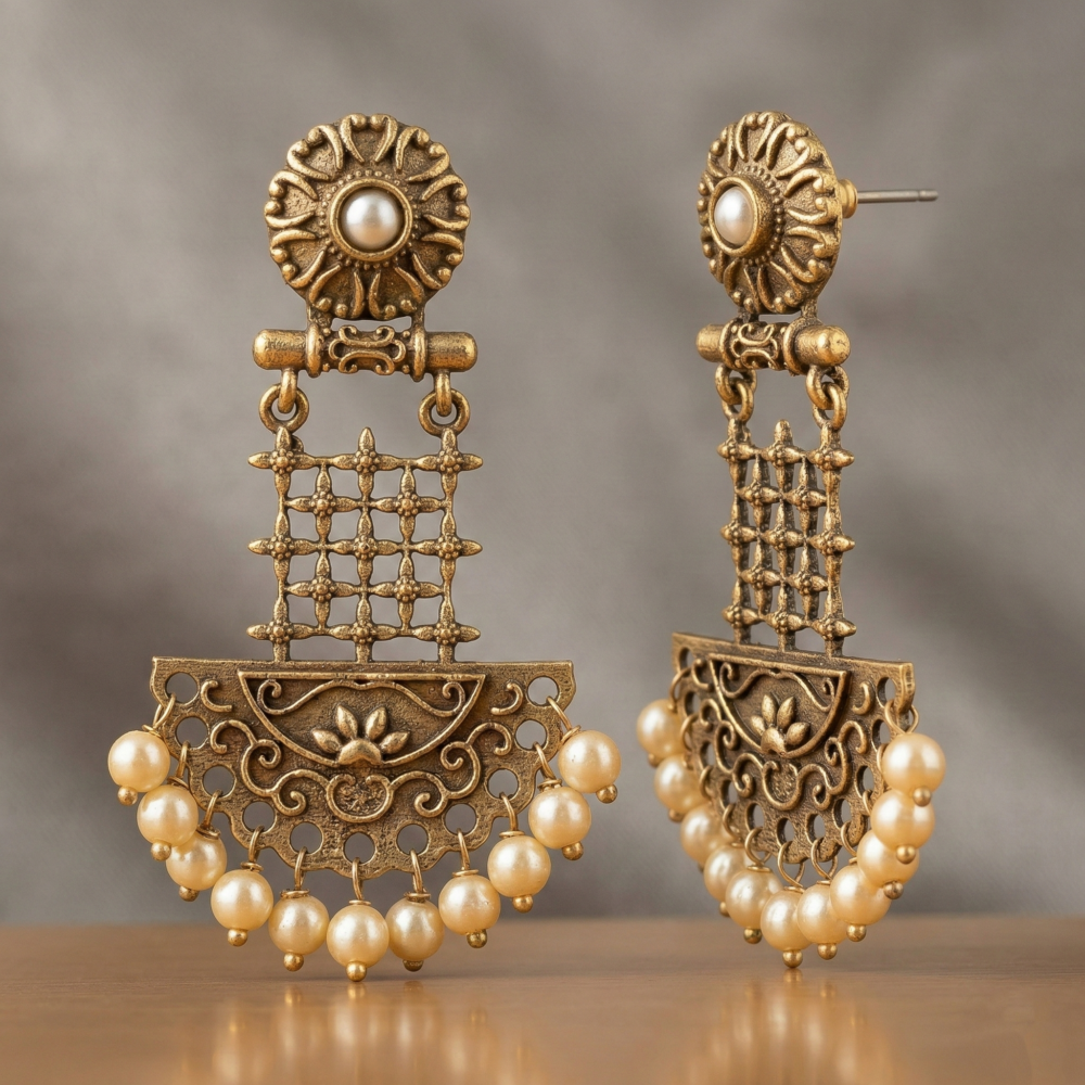 • Design: The earring starts with a sun-inspired floral stud centered with a pristine pearl. It transitions into a structured rectangular lattice (jali) work, leading down to a majestic crescent-shaped (Chandbali) base.