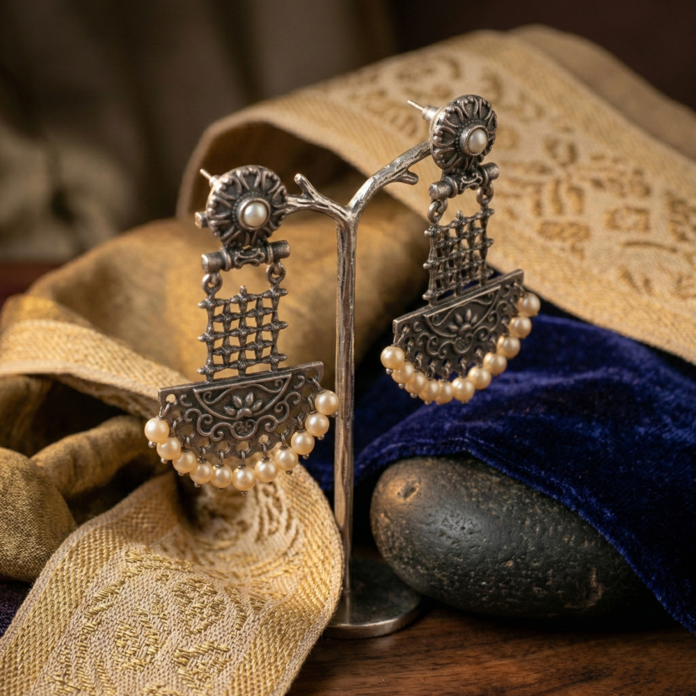 Elevate your ethnic charm with these exquisite oxidized silver-finish jhumkas. Featuring intricate floral motifs, a unique lattice-work neck, and delicate cream pearl hangings, these earrings perfectly blend vintage tribal aesthetics with royal elegance.