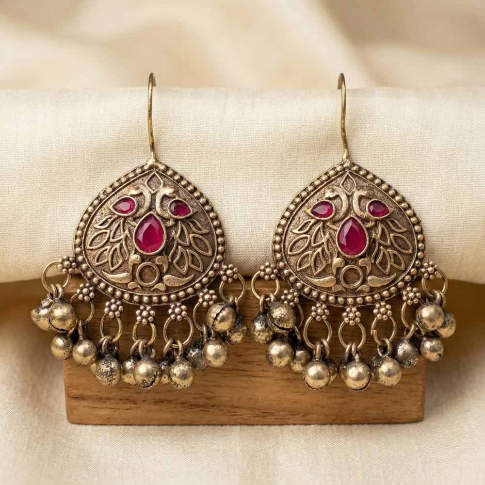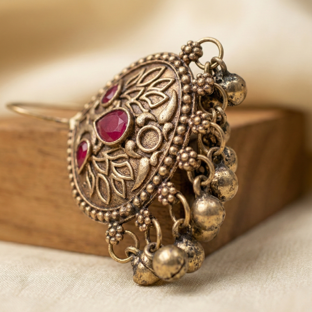 • The Signature Jhumka Chime: Finished with a rhythmic fringe of Oxidised Ghungroos, these earrings offer that classic metallic “thumka” and movement that defines traditional Indian festive wear.
